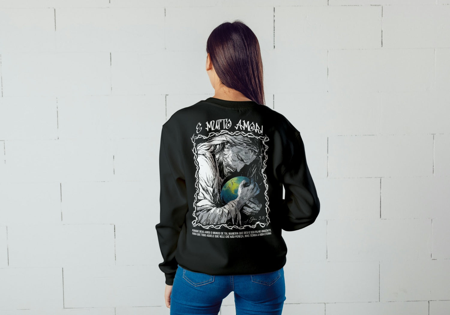 Mais do que conforto, esta sweat leva uma mensagem. Cada olhar é uma oportunidade para mostrar o amor incomparável de Deus.